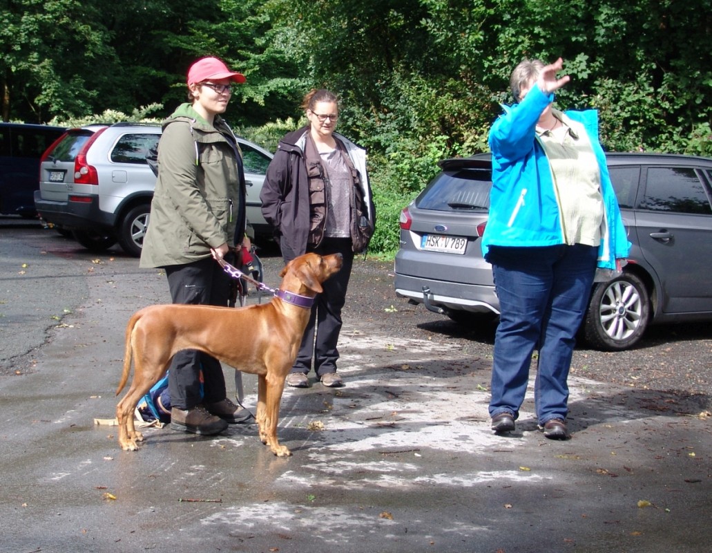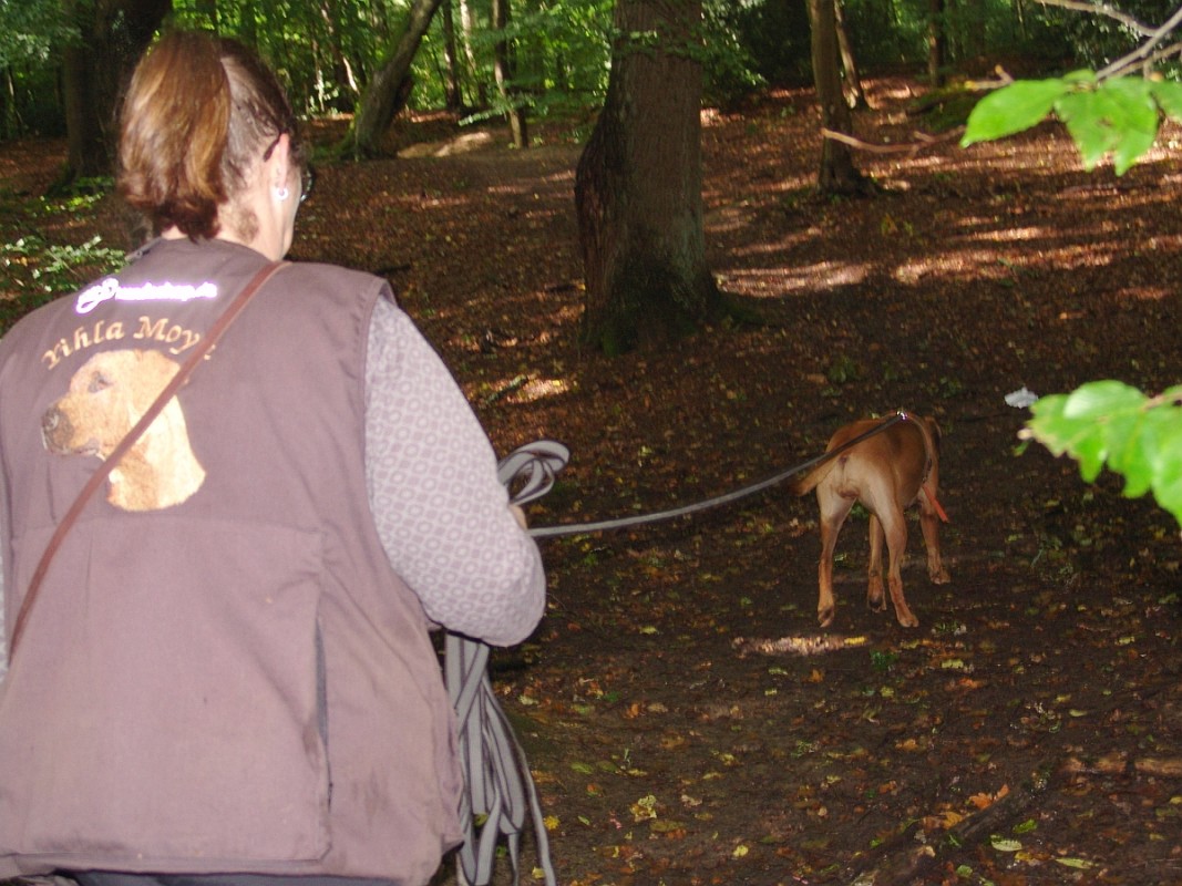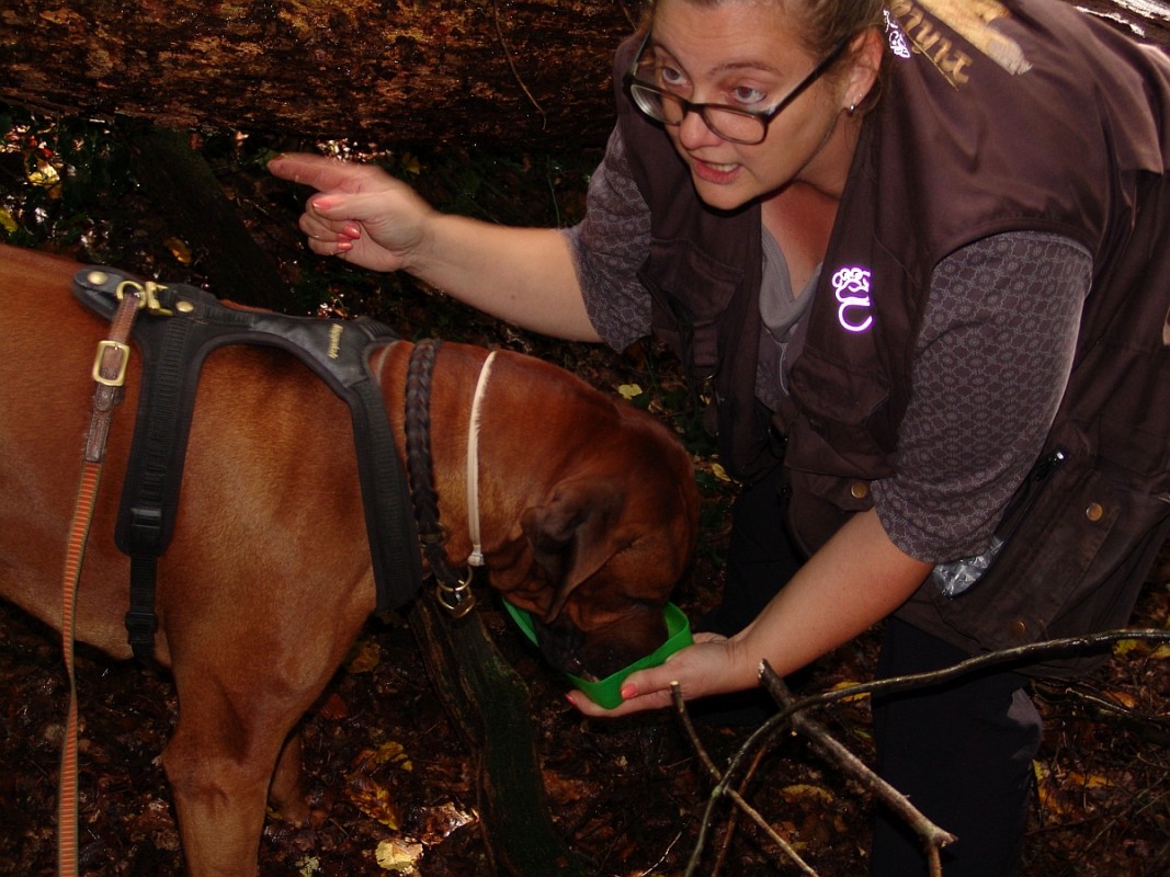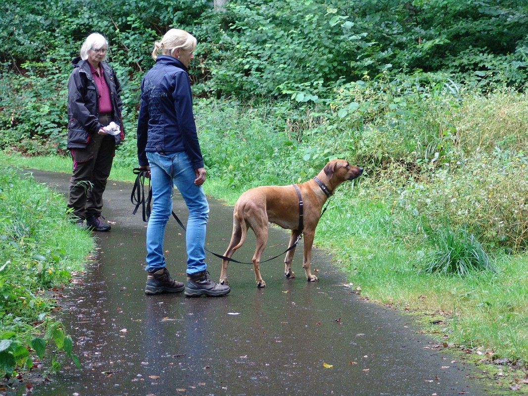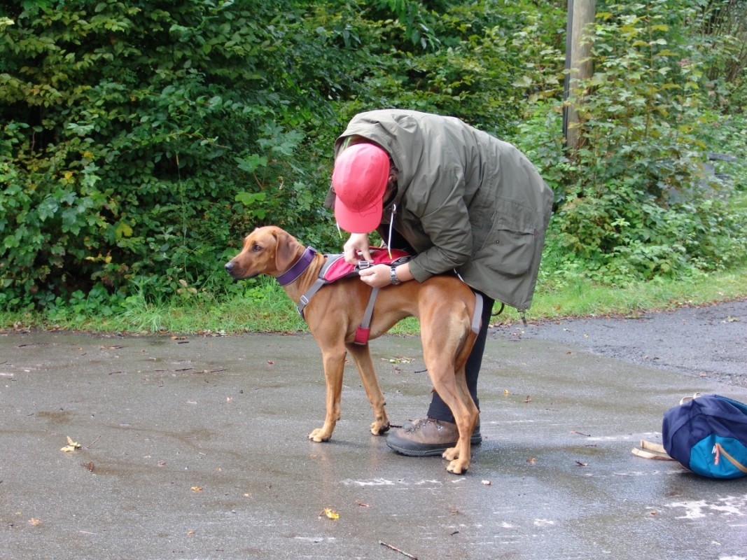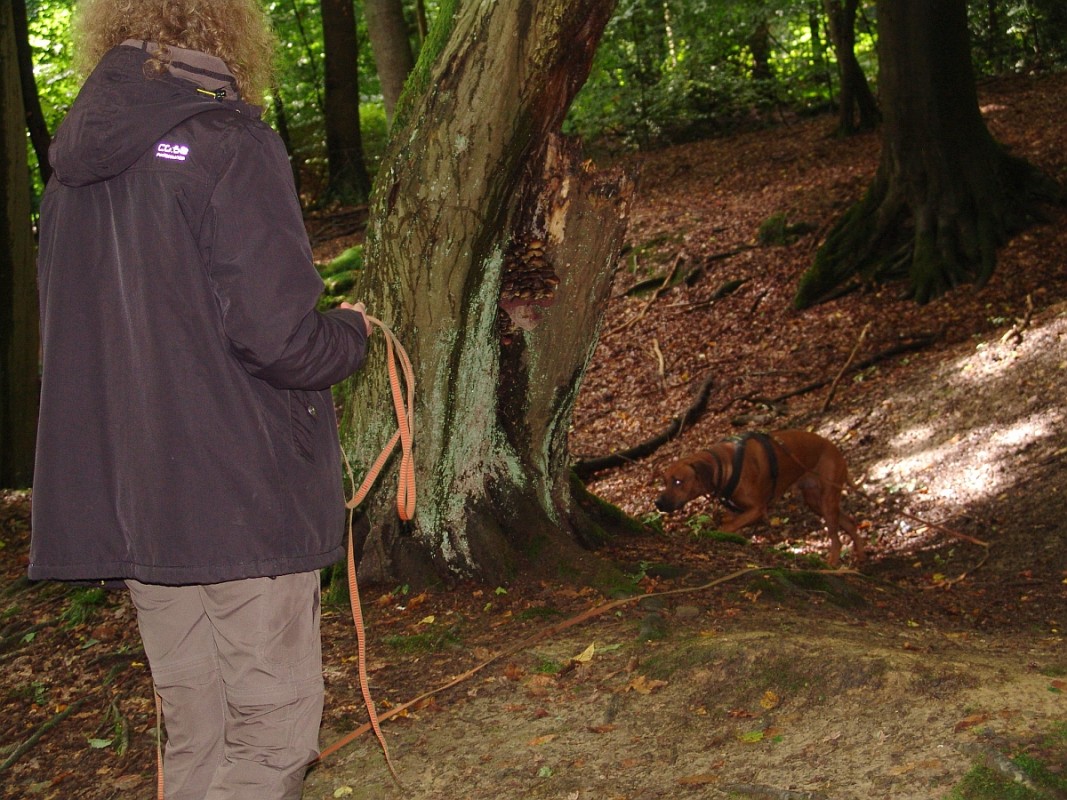 Nach der Mittagspause wurden die ersten Trails durchgeführt. Da leider so wenige Teams dem Aufruf der Landesgruppe gefolgt waren entstanden kaum Wartezeiten für die Teilnehmer und hier zeigte sich wieder, dass unsere Ridgis schnell verstehen worum es geht. Alle Teams waren mit Eifer und Konzentration bei der Sache und der versteckte Mensch wurde von allen ohne Probleme gefunden, und der Spaß, den die Hunde an diesem selbstständigen Arbeiten hatten, konnte man deutlich sehen. Zum Abschluss des ersten Tages konnten wir Susanne und Vasco begleiten, um ein erfahreneres Team bei der Arbeit live zu sehen.