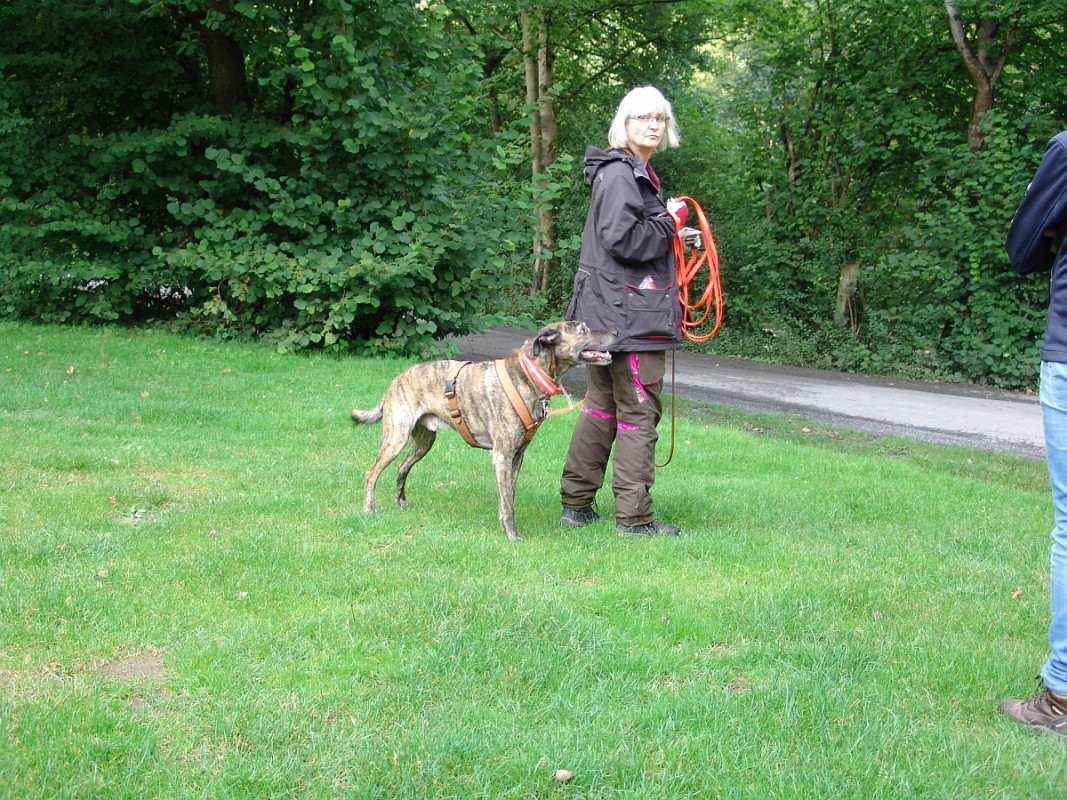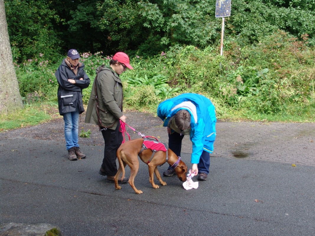 Los ging es für vier Teams am Samstag um 10 Uhr mit einer Power-Point Präsentation, die uns die Wissensgrundlagen der Hundenase deutlich machte. Aufgelockert wurde diese durch kleine Filme von trailenden Hunden in verschiedenen Altersklassen um zu demonstrieren, wie man das „Finden eines Menschen“ trainiert. Die Ausrüstung, die für das Mantrailing verwendet werden kann, wurde uns ebenfalls ausführlich erklärt und zum „Anfassen“ in die Hand gegeben.
