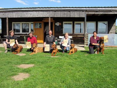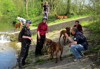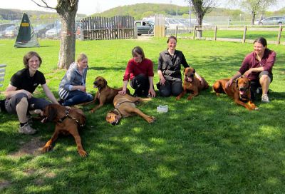 Sechs RR nahmen schließlich gemeinsam mit einem Riesenschnauzer und einem Stafford an der Prüfung teil. Bis zum Start galt es ähnlich wie bei einer Ausstellung, den Vormittag zu überbrücken. In der Zeit wuchs die Neugier darauf, wie sich die Hunde in der ungewohnten Situation wohl verhalten würden. Was, wenn alle vorne laufen wollen, sich die ganze Zeit gegenseitig anstacheln würden? Die Gedanken waren unbegründet, am Ende fand jeder mit seinem Hund genau den Platz, an dem er gut laufen konnte.