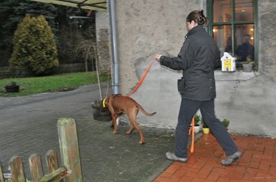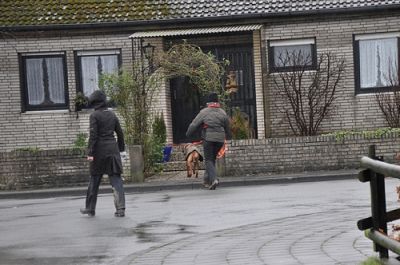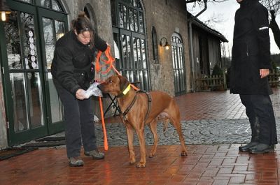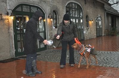 Nicht nur, dass die Hunde im Wohngebiet, in Gebäuden oder im Pferdestall trailen und steile Treppen überwinden sollten, nein, denn da es das Wetter nicht gut mit uns meinte, wurde nun auch unter Extrembedingungen bei Platzregen und starken Windböen gearbeitet. Diese Maximalanforderung machte sogar Profimantrailern, die mehrmals die Woche trainieren, zu schaffen. Aber unsere Hunde bewiesen, dass sie die Grundlagen bereits einwandfrei beherrschen und zeigten absolutes Durchhaltevermögen und unerbittlichen Arbeitswillen. Keine Barriere (z.B. steile enge Holztreppen oder Türen) und Ablenkung (z.B. Passanten, Autos, Katzen oder Pferde) war groß genug, keine Versteckperson blieb verschollen und auch die Differenzierung zwischen mehreren Personen am Ziel klappte meist problemlos. Was für ein Erfolg - weiter so!