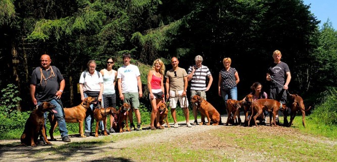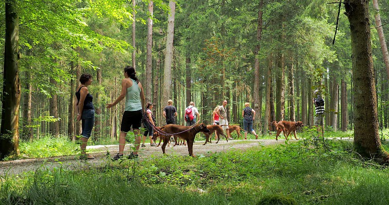 Am Sonntag, 20.07.2014 trafen wir uns um 10:00 am Forsthaus St.Hubertus im Ebersberger Forst zur Ridgebackwanderung der LG 7/8. Es hatten sich 10 Ridgebacks mit ihren 11 Zweibeinern eingefunden. Nach einer kurzen Einweisung ging es los. Der Ebersberger Forst hat eine Ausdehnung von 90 km² wovon 50 km² dem Wild vorbehalten sind. Der gute Wildbesatz des Parks läßt sich an vielen Stellen deutlich erkennen. Auf den Wiesen haben vermutlich am Morgen noch die Sauen gebrochen. Neben dem Schwarzwild findet man im Ebersberger Forst auch Reh- und Rotwild, viele Hasen sowie einige Schlangen.