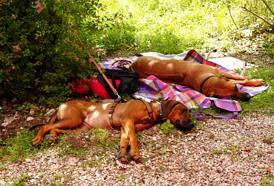 Angesichts der hochsommerlichen Temperaturen haben wir die Wanderstrecke etwas verkürzt. Die kleinen Ridgebacks durften sich zwischendurch fahren lassen, die Wandergeschwindigkeit wurde den Temparaturen angepasst und es wurden viele kleine Pausen eingelegt, sodass in gemütlicher Runde viel Zeit für Gespräche blieb. Die Ridgebacks und ihre Menschen haben sich hervorragend verstanden – Unser Kompliment an die sehr gute Führigkeit der Hunde.
