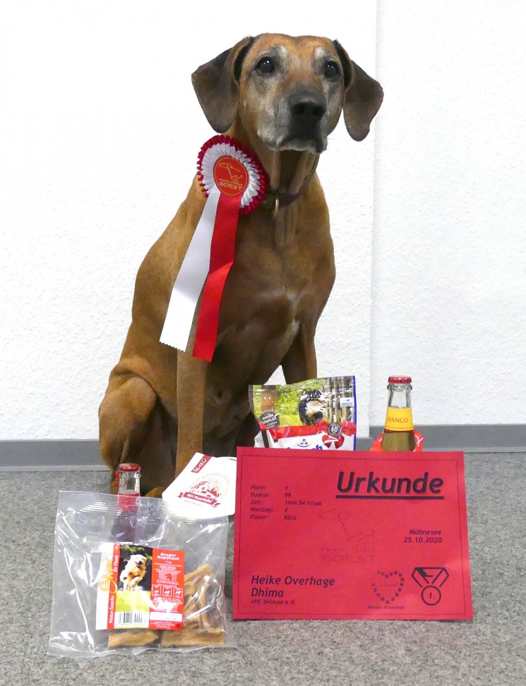 Am 25.10.2020 Nachmittag startete ZimaZaa Dhima Kuwana Vizuri beim Rally Obedience Turnier am Möhnesee bei den Flotten Pfoten e.V. als einzige Starterin in der Seniorenklasse und erlief sich unter der Richterin Monika Krawietz, 99 Punkte, vorzüglich!
