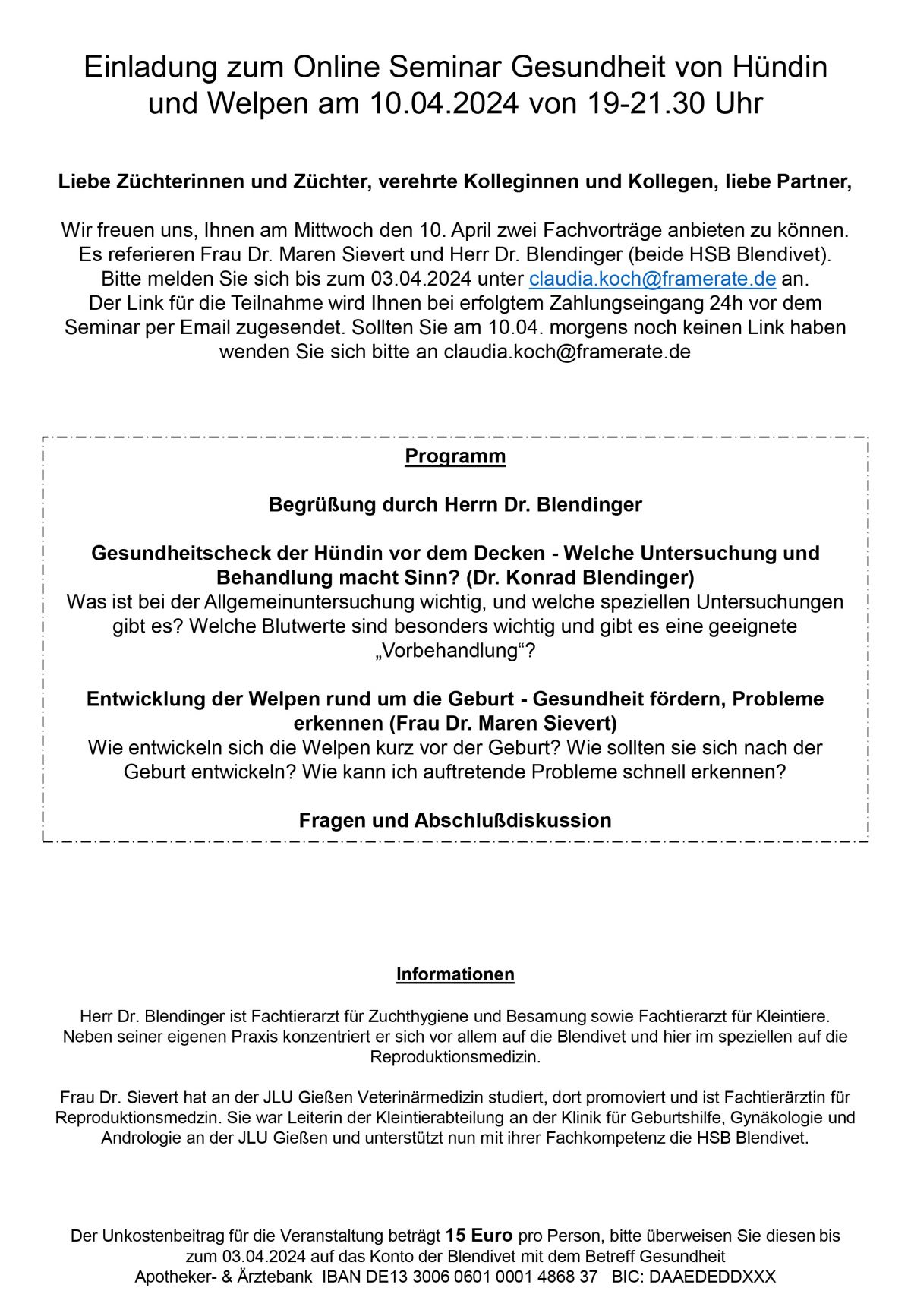 10.04.2024 Online Seminar Gesundheit von Hündin und Welpen (kostenpflichtig)